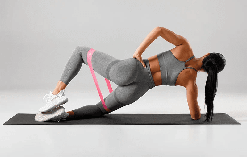 Lie on your side with your knees bent and a resistance band placed just above them. Keep your feet together and your hips stacked. Slowly lift your top knee while keeping your pelvis steady. Do not roll backward.