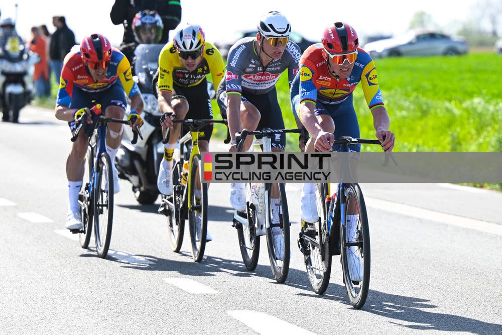The Brits are coming into this race on a high note, after Ganna’s win midweek at the Dwars door Vlandeeren. However, the Italian won’t be at the startline, as he wants to fully focus on Paris-Roubaix. Even though the Italian’s absence, the Tarling-Turner-Sheffield trio seems like a competitive one. Meanwhile, the feelings at Soudal are quite different before their home race.