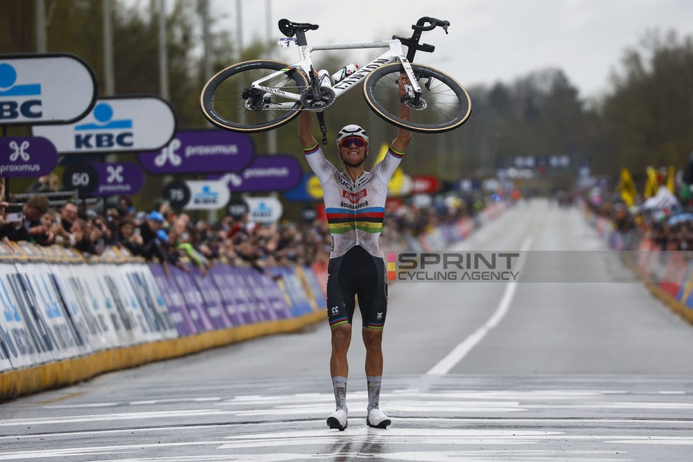 But that’s where the inevetible finally happened. Van Aert tried to anticipate Tadej’s attack right before the climb, but not even that could stop him from dropping all his rivals and riding off into the Belgian sunset. In the end he won by over a minute ahead of Mads Pedersen, who was able outsprint Van der Poel.